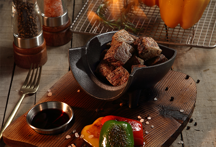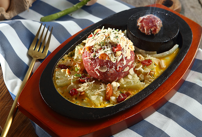 【紅酒火焰牛排】牛排切成粒狀,適合一口一個的大小。上桌后加入紅酒、白蘭地點燃,讓酒精充分燃燒后滲入牛肉粒中,這樣的牛肉不僅會更嫩滑,還會有一股酒香散發出來。(不懂吃完算不算酒駕?)由于這道菜的選料要求比較高,所以每天限量15-17份左右。